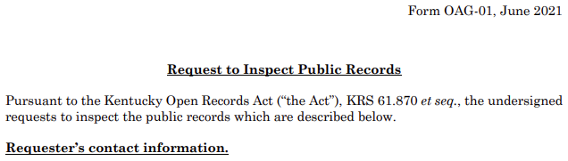 The Calloway County Clerk's Office requires that open records requests are submitted using the appropriate form. The Attorney General's Office has produced a general form, please print the form and submit it to our office. If the applicant cannot print this form, the applicant may make a written request, which shall include the applicants name, phone number, address, list of precise documents being requested, residency of the applicant, and any additional information the applicant deems necessary to help this office fulfill the open records request.